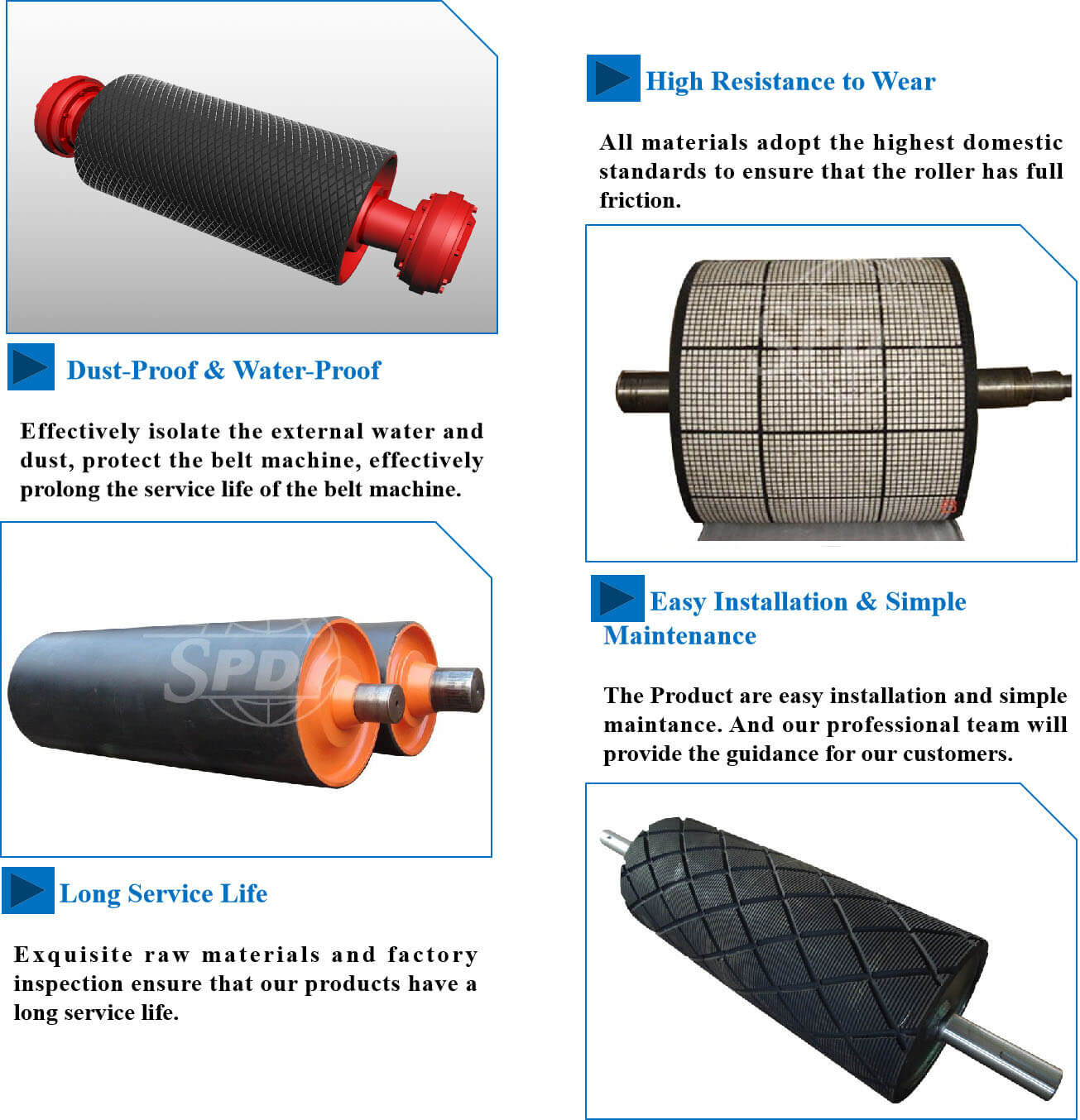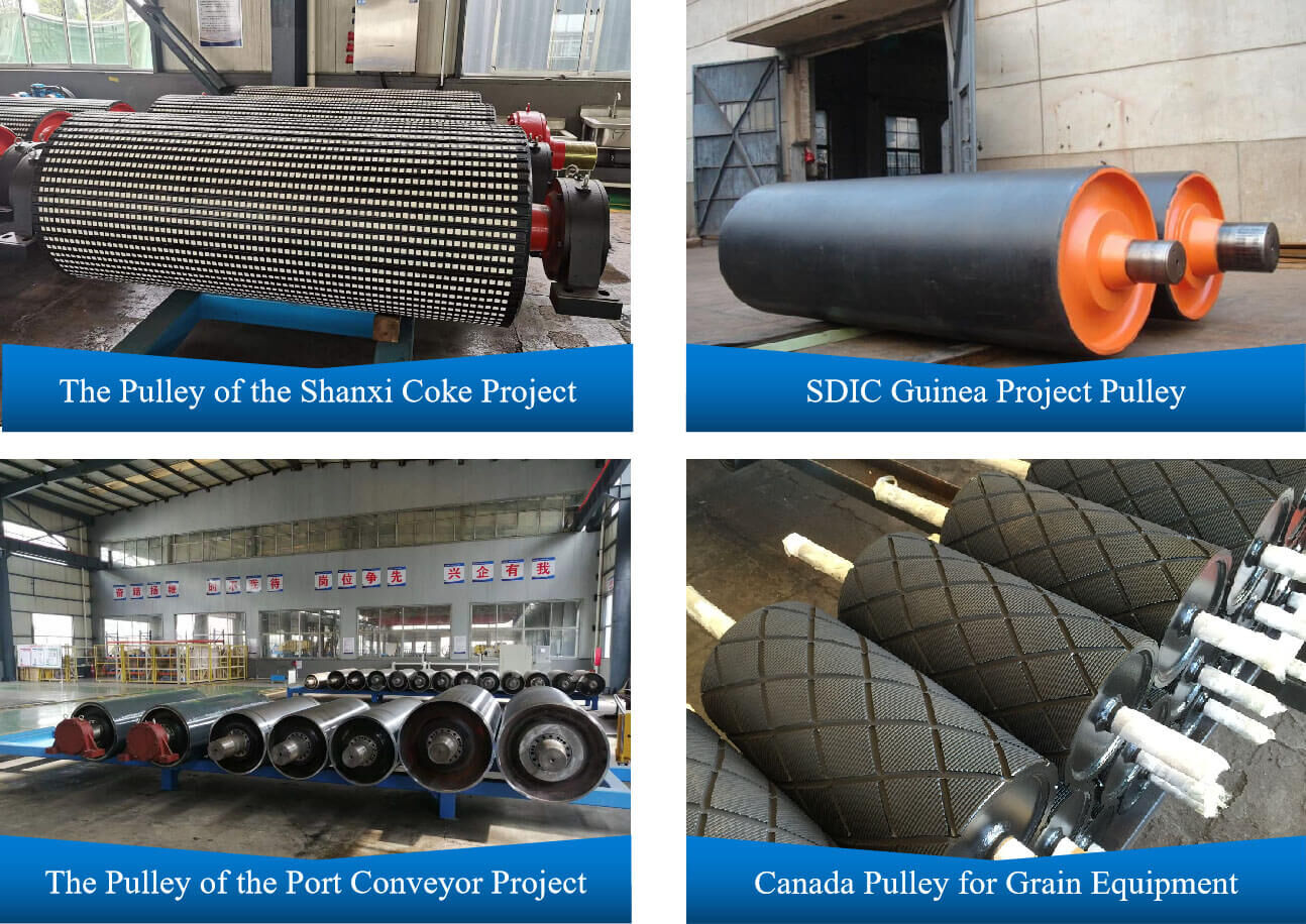 Конвейерный шкив остается на двух концах ленточной машины. Шкив можно разделить на две категории: ведущий шкив и отводной шкив, ведущий шкив является основной частью для передачи мощности, и существует два типа наборов шкивов: гладкая поверхность и резиновая поверхность, а резиновая поверхность может быть классифицирована как гладкая резиновая поверхность. , резиновая поверхность в виде елочки и алмазная резиновая поверхность для удовлетворения различных технических требований. Отводящий шкив можно разделить на гладкую резиновую поверхность и гладкую стальную поверхность.